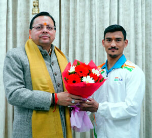 देहरादून: मुख्यमंत्री श्री पुष्कर सिंह धामी से आज मुख्यमंत्री आवास में अंतरराष्ट्रीय स्तर पर उत्कृष्ट प्रदर्शन कर प्रदेश और देश का नाम रोशन करने वाले बॉक्सर पवन बर्त्वाल ने शिष्टाचार भेंट की। हाल ही में ग्रेटर नोएडा में आयोजित वर्ल्ड बॉक्सिंग कप 2025 में पवन बर्त्वाल ने शानदार प्रदर्शन करते हुए रजत पदक अपने नाम किया था। इस उपलब्धि पर मुख्यमंत्री ने पवन को बधाई दी और उनके उज्ज्वल भविष्य की कामना की।